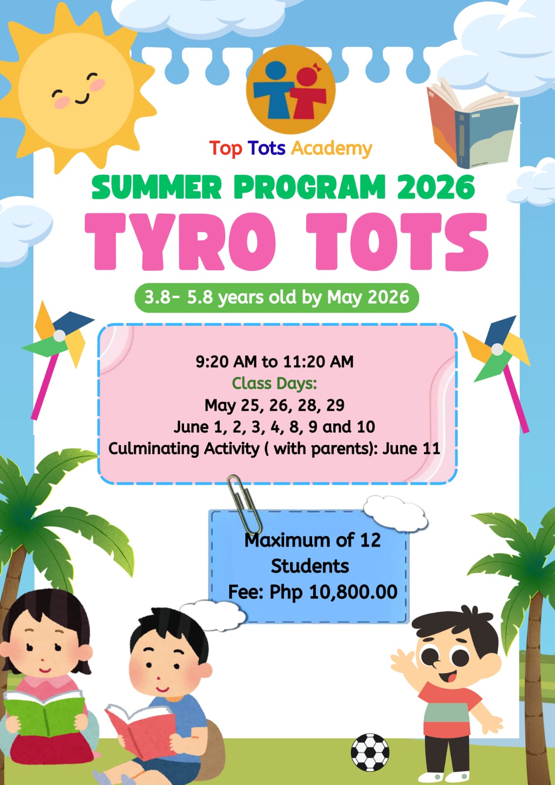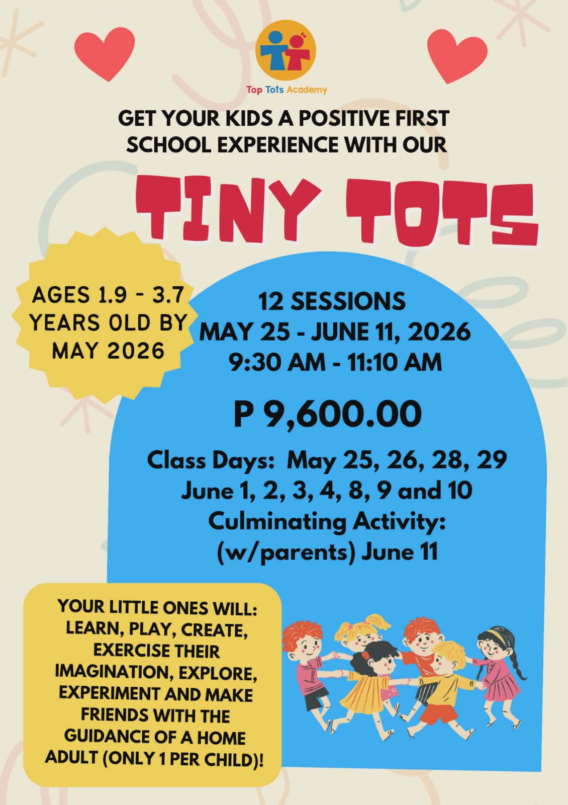 Enrolling your child this coming school year? Then let him or her prepare by joining our Tiny Tots Class! This fun class will encourage school readiness when the formal school year begins this July 2026. Your child will be introduced to basic classroom routines, socialization and a lot of fun activities that will challenge them to explore, think and create.