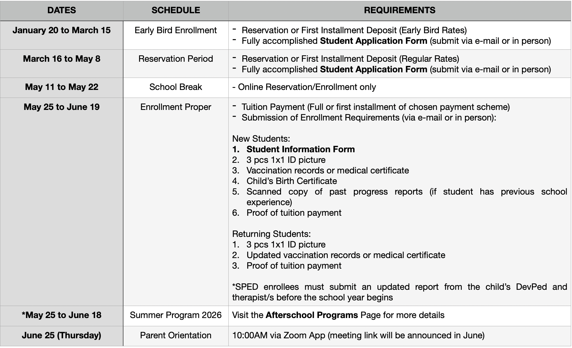 *SPED enrollees must submit an updated report from the child’s DevPed and therapist/s before the school year begins.