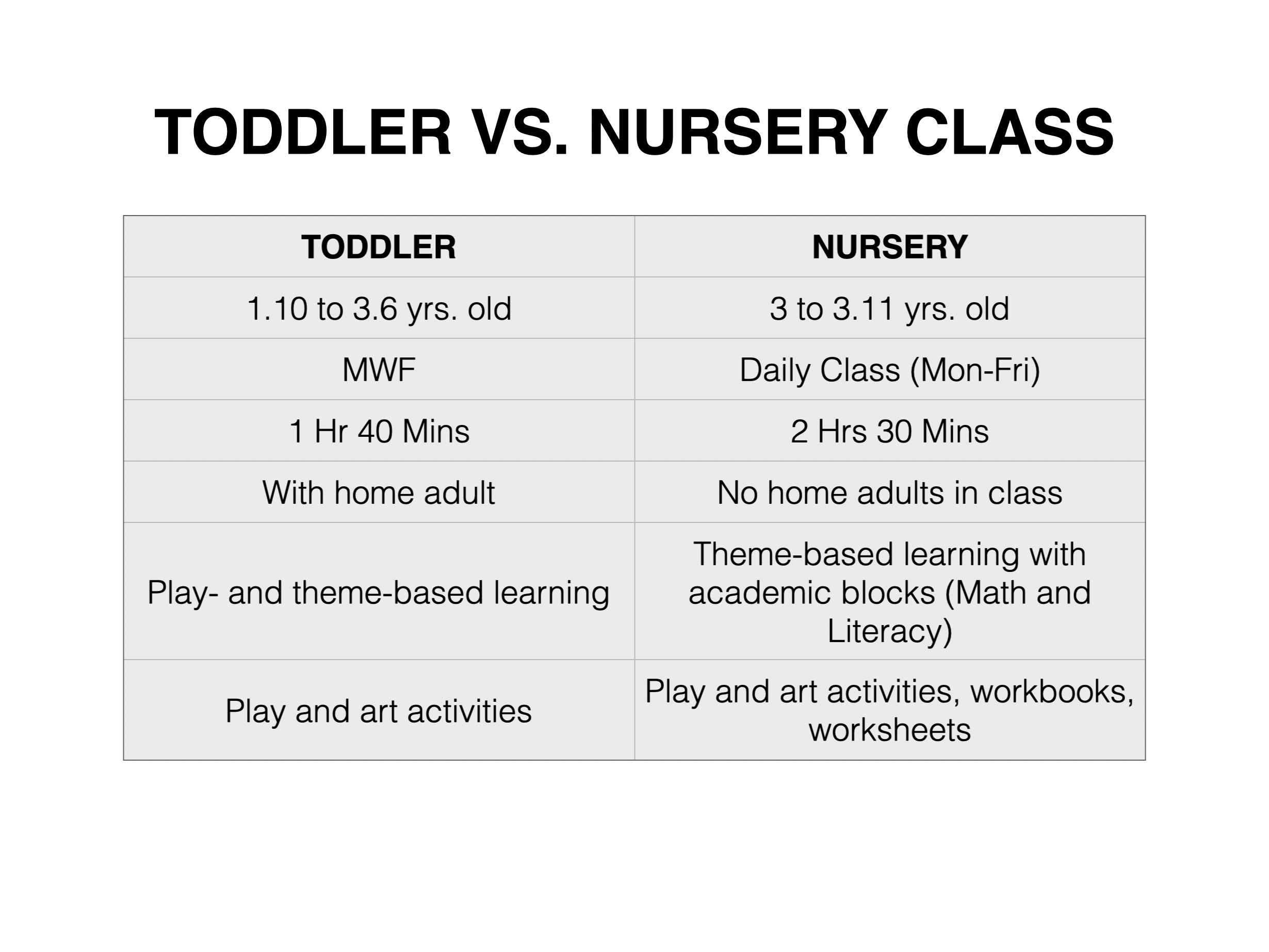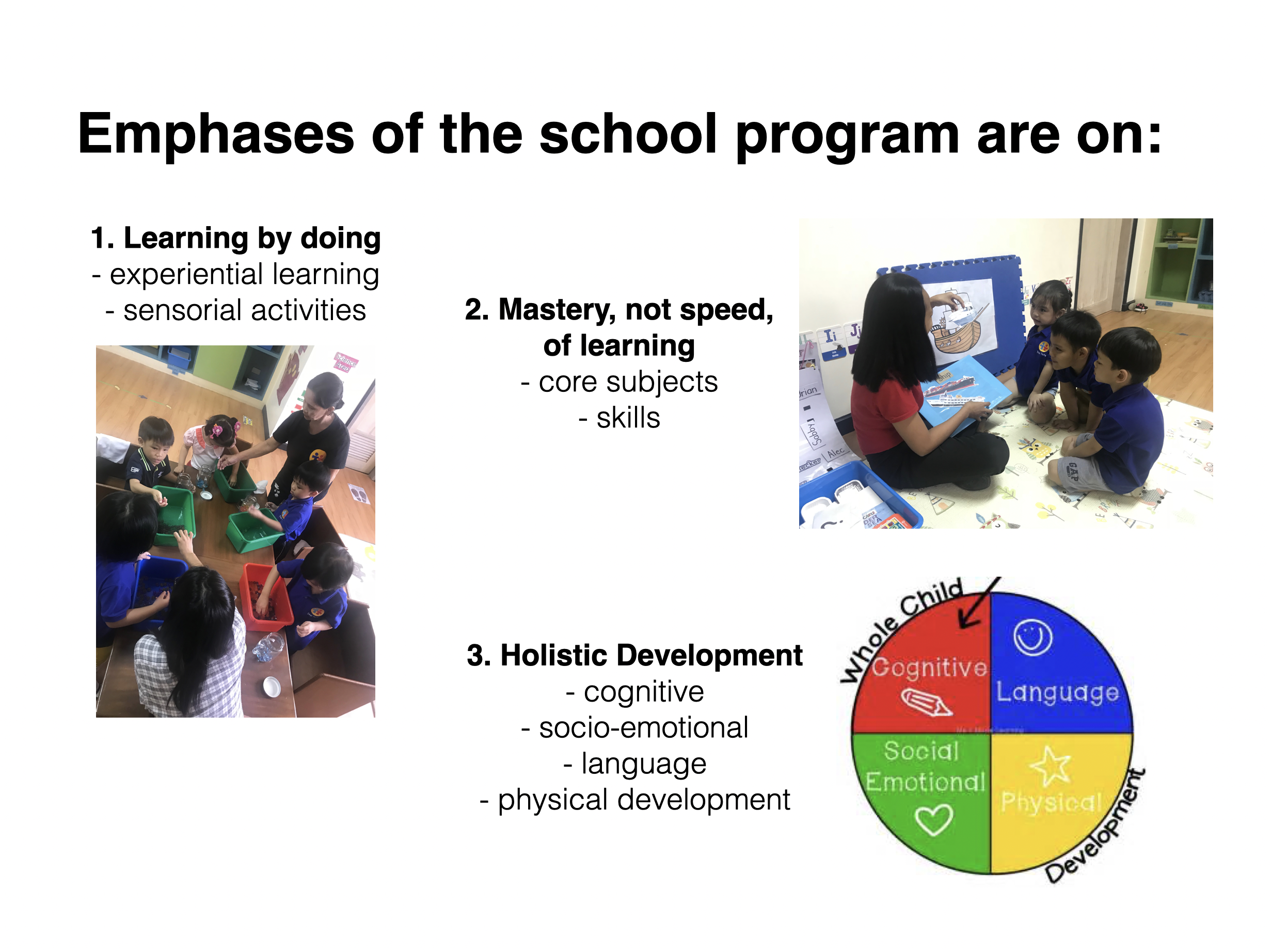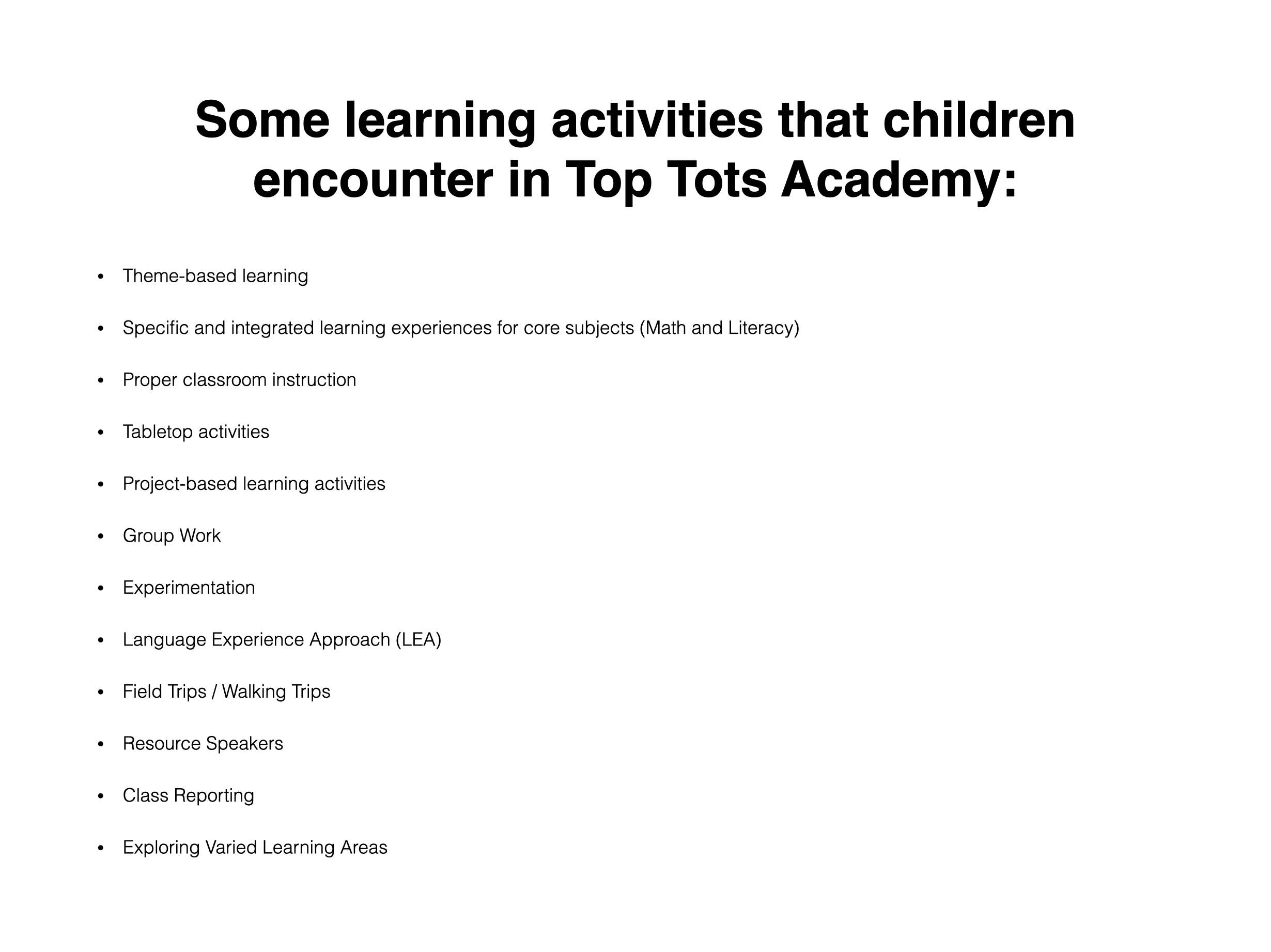 Take a look at what goes on inside the Top Tots Academy classrooms. Read through our slides by clicking on the image below. Tap on the left or right arrow to navigate.